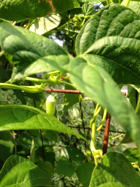 Beanie, cleverly hiding among the pole beans. That's him in the green with golden accents.